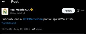 ريال مدريد عقب المبارة وحصد برشلونة اللقب هنأ البرسا، ونشر عبر صفحته الرسمية على منصة “إكس”، “تهانينا لبرشلونة على لقب الدوري الإسباني 2024-2025”.