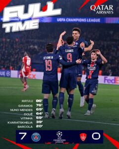 أكد باريس سان جيرمان تأهله إلى دور الـ16 من دوري أبطال أوروبا بأقوى طريقة ممكنة، بعدما أمطر شباك مواطنه بريست بسبعة أهداف نظيفة في إياب الملحق، ليحسم العبور بمجموع (10-0) في مباراتي الذهاب والإياب.