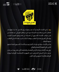 وأضاف: “ووفقًا لذلك غادرت بعثة النادي الملعب، ونادي الاتحاد سيتابع حيثيات القرار، ويدعو الاتحاد الآسيوي لحفظ حقوق النادي التي كفلتها الأنظمة واللوائح”.