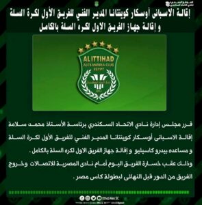 قرر مجلس إدارة نادي الاتحاد السكندري، برئاسة الأستاذ محمد مصيلحي، إقالة المدير الفني الإسباني أوسكار كوينتانا ومساعده بيدرو كاسيليو، بالإضافة إلى الجهاز الفني بالكامل للفريق الأول لكرة السلة.