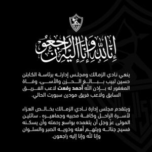 ينعي نادي الزمالك ومجلس إدارته برئاسة الكابتن حسين لبيب ببالغ الحزن والأسى، وفاة المغفور له بإذن الله أحمد رفعت لاعب الفريق السابق ولاعب فريق مودرن سبورت الحالي.