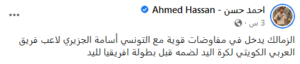 وكتب أحمد حسن، عبر منشور على “فيسبوك”: “الزمالك يدخل في مفاوضات قوية مع التونسي أسامة الجزيري، لاعب فريق العربي الكويتي، لكرة اليد لضمه قبل بطولة أفريقيا لليد”.