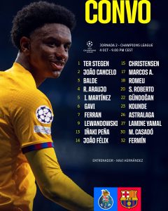 أعلن “تشافي هيرنانديز” المدير الفني لفريق برشلونة، عن قائمة فريقه المستدعاة لمواجهة بورتو البرتغالي، فب المباراة المقرر له بعد غدٍ الثلاثاء.