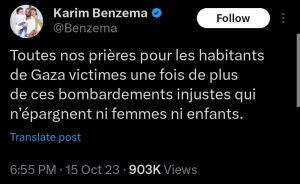 وغرد بنزيما عبر صفحته الرسمية على مواقع التواصل الاجتماعي “تويتر” قائلًا: “كل دعائنا من أجل سكان غزة، الذين يقعون مرة أخرى ضحية لهذه القصف الظالم الذي لا يستثني النساء ولا الأطفال”.