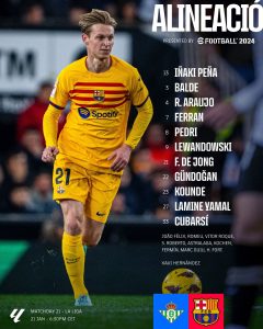 أعلن “تشافي هيرنانديز” المدير الفني لبرشلونة عن تشكيل فريقه لمواجهة اليوم أمام ريال بيتيس، في اللقاء المقرر له على ملعب “بينيتو فيامارين” معقل الريال.