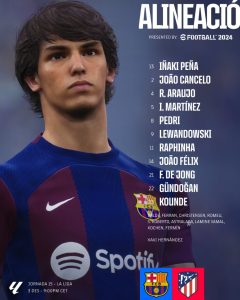 أعلن “تشافي هيرنانديز” المدير الفني لفريق برشلونة، عن تشكيل فريقه الرسمي لمواجهة أتلتيكو مدريد،اليوم الأحد.