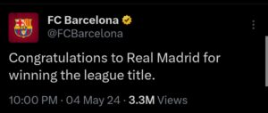 ودون الموقع الرسمي لبرشلونة عبر منصة “إكس” قائلًا: “مبروك لنادي ريال مدريد، بطل الدوري لموسم 2023-2024”.