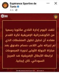 ونشر النادي التونسي عبر حسابه على فيس بوك ” تلقت اليوم إدارة النادي مكتوبا رسميا من الاتحاد الأفريقي لكرة القدم يفيد بأن تحليل تناول المنشطات الذي تم إجرائه على اللاعب حسام دقدوق بعد مباراة الجولة الأولى لدور المجموعات لدوري أبطال أفريقيا أمام المريخ السوداني جاء إيجابيا”.