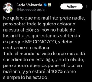 فيدي عبر منصة “إكس” برر تصريحاته وقال: “فيدي فالفيردي عبر إكس: “لا أريد أن يُسيء أحد فهمي، لكن قبل كل شيء أريد التوضيح لجماهيرنا؛ إذا لم أتحدث اليوم عن التحكيمات التي نعاني منها، فذلك لأنني أعرف نفسي، ويجب أن أركز على الغد”.