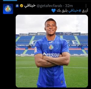 حساب خيتافي الرسمي على منصة “إكس” عقب قرار مبابي دون: “أزرق خيتافي يليق بك” مع نشر صورة لكيليان بقميص النادي الإسباني.