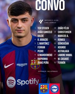 أعلن “تشافي هيرنانديز” المدير الفني لفريق برشلونة، عن قائمة فريقه المستدعاة لمواجهة ألافيس، في اللقاء المقرر له غدًا الأحد.