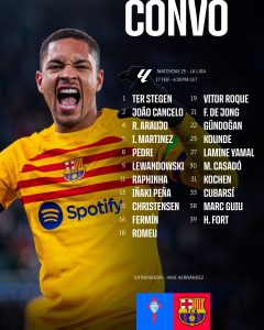 أعلن “تشافي هيرنانديز” المدير الفني لفريق برشلونة عن قائمة فريقه المستدعاة لمواجهة سيلتا فيجو، في اللقاء المقرر له غدًا السبت.