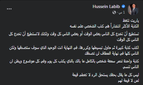 وقال لبيب عبر فيس بوك “ياريت نتعظ، الكذبة الأكثر انتشارا هي كذا الشخص على نفسه”.