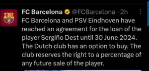 ونشر النادي صباح اليوم بيانًا عبر صفحته على وسائل التواصل الاجتماعي “تويتر” أوضح فيه تفاصل الصفقة: “نادي برشلونة ونادي أيندهوفن الهولندي توصلا لإتفاق من أجل الحصول على خدمات” سيرجينيو ديست” الظهير الأيمن للفريق معارًا حتى يونيو 2024 مع أحقية الشراء”.