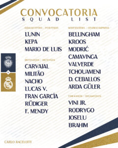 أعلن الإيطالي “كارلو أنشيلوتي” المدير الفني لفريق ريال مدريد، عن قائمة فريقه المستدعاة لمواجهة مايوركا، في اللقاء المقرر له غدًا السبت.