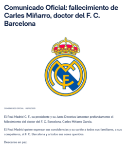 تضامن ريال مدريد مع نظيره برشلونة، في وفاة طبيب كارليس مينيارو “كارليس مينيارو”.
