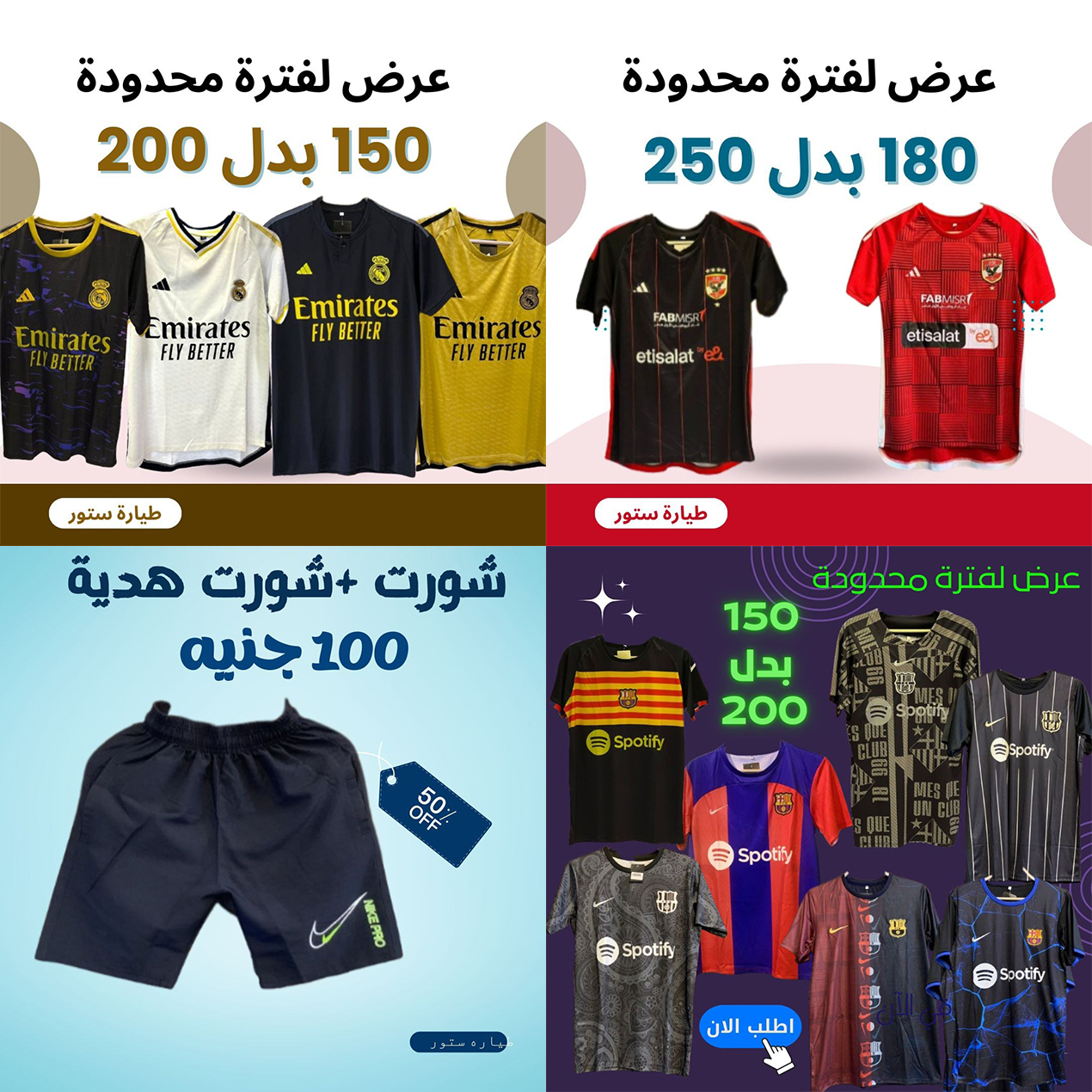 تشمل العروض تيشرتات العديد من الأندية الشعبية، مثل الأهلي والزمالك وريال مدريد وبرشلونة وارسنال ةمانشستر يونايتد والسيتي والنصر والاتحاد والهلال، وتتميز بتصاميم جذابة وجودة عالية.