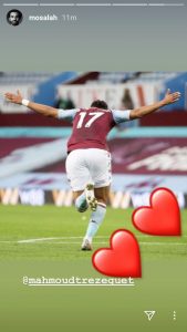 ونشر صلاح عبر حسابه الشخصي على موقع التواصل الاجتماعي “إنستجرام” صورة لاحتفال محمود تريزيجيه بسادس أهدافه في أول مواسمه ببريميرليج، والذي جاء من تصويبة صاروخية على الطائر.
