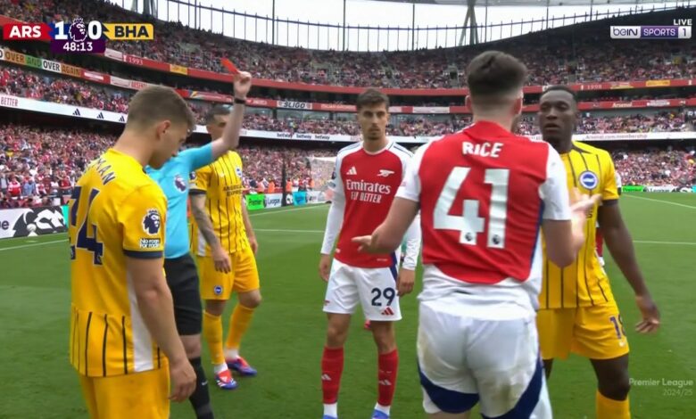 طرد ديكلان رايس في مباراة ارسنال وبرايتون بالدوري الانجليزي