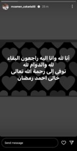 وكتب مؤمن زكريا حالة عبر حسابه على انستجرام قال فيها: “انا لله وانا اليه راجعون البقاء لله والدوام لله.. توفي إلى رحمة الله تعالى خالي أحمد رمضان”.
