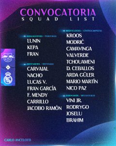 وشهدت قائمة ريال مدريد غياب عدد من اللاعبين المؤثرين على رأسهم جود بيلينجهام، تيبو كورتوا، إيدر ميليتاو، ديفيد ألابا وأنطونيو روديجر.