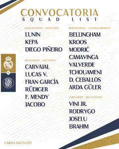 أعلن “كارلو أنشيلوتي” المدير الفني لفريق ريال مدريد، عن قائمة فريقه المستدعاة لمواجهة جيرونا، في المباراة المقرر لها غدًا السبت.