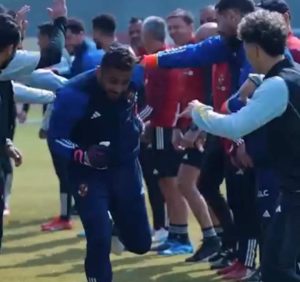 وحرص لاعبو الأهلي على الترحيب بالثنائي عمر كمال ومحمود الزنفلي قبل انطلاق فقرات المران.