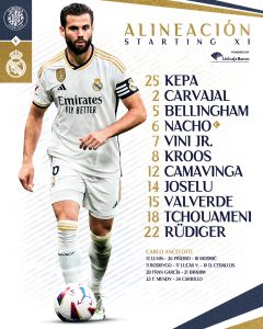 وفي إطار ذلك أعلن “كارلو أنشيلوتي” المدير الفني لفريق ريال مدريد، عن تشكيل فريقه لمواجهة اليوم كالتالي: