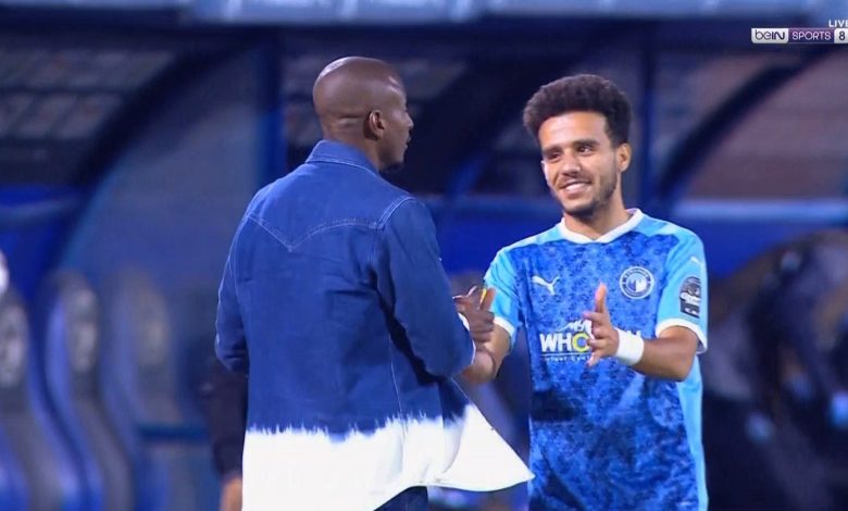 لقطة مصطفي فتحي مع موكوينا مدرب صن داونز في دوري ابطال افريقيا