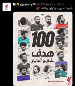 صفحة ليفربول الرسمية عبر “إكس” تغنت بالفرعون المصري بعد الـ 100 هدف ودونت: “شيخ الحروب وكهلها وفتاها”.