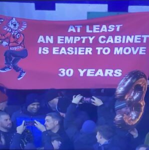 جماهير الخصم ليفربول تهكمت على أيفرتون ورفعت لافتة مدون عليها: “على الأقل خزينة كؤوسكم فارغة ومن السهل نقلها“.