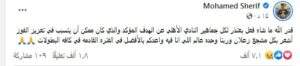 ونشر محمد شريف عبر حسابه على فيس بوك “قدر الله ما شاء فعل بعتذر لكل جماهير النادي الأهلي عن الهدف المؤكد والذي كان ممكن آن يتسبب في تعزيز الفوز أشعر بكل مشجع زعلان وربنا وحده عالم اللي انا فيه واعدكم بالأفضل في الفتره القادمه في كافه البطولات”.