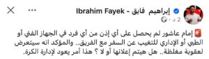 أكد إبراهيم فايق على فيسبوك أن، إمام عاشور، لم يحصل على أي إذن من الجهاز الفني أو الطبي أو الإداري للتغيب عن السفر مع الفريق، مما يضعه أمام مواجهة عقوبة مغلظة.