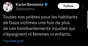 وغرد بنزيما عبر صفحته الرسمية على مواقع التواصل الاجتماعي “تويتر” قائلًا: “كل دعائنا من أجل سكان غزة، الذين يقعون مرة أخرى ضحية لهذه القصف الظالم الذي لا يستثني النساء ولا الأطفال”.