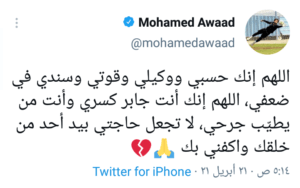 ونشر محمد عواد علي حسابة الرسمي علي موقع التواصل الاجتماعي “تويتر” : “اللهم انك حسبي ووكيلي وقوتي وسندي في ضعفي، اللهم إنك انت جابر كسري وأنت من يطيب جرحي لا تجعل حاجتي بيد أحد من خلقك واكفني بك”.