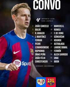 أعلن “تشافي هيرنانديز” المدرير الفني لبرشلونة عن قائمة فريقه المستدعاة لمواجهة رايو فايكانو، في المباراة المقرر لها غدًا السبت.