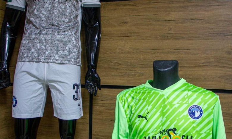 ويظهر نادي بيراميدز بالطاقم الثاني باللون الجراي في الأبيض، فيما يرتدي حارس المرمى اللون الأصفر الكامل.