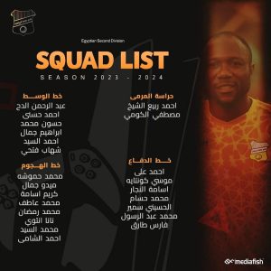 أحمد ربيع الشيخ – مصطفي الكومي – ميدو جمال – الحسيني سمير – أحمد علي – محمد حموشة – أحمد حسني – كريم أسامة – محمد حسام الشرخة – أحمد السيد – فارس طارق – أحمد الشامي، أسامة النجار – شهاب فتحي – حسون محمد – محمد عادل – عبد الرحمن الدح – محمد عاطف – موسي كوناتيه – إبراهيم جمال – محمد رمضان – نانا أنتوي – محمد السيد.