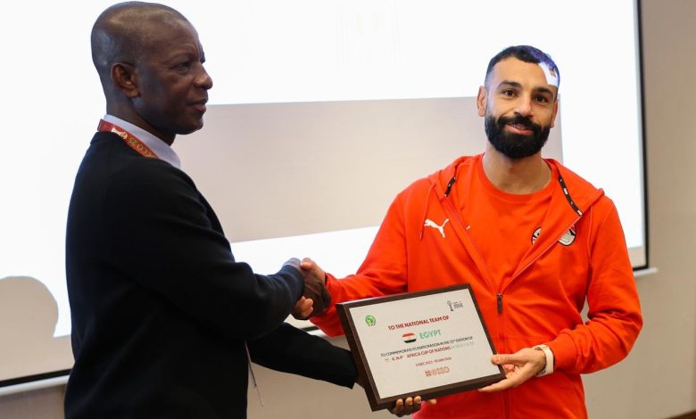 شهد الاجتماع التنظيمي للاتحاد الأفريقي لكرة القدم تكريم محمد صلاح، قائد منتخب مصر، ومنحه شهادة مشاركة في النسخة الـ35 من كأس الأمم الأفريقية، التي تستضيفها المغرب وتنطلق يوم 21 ديسمبر الجاري.