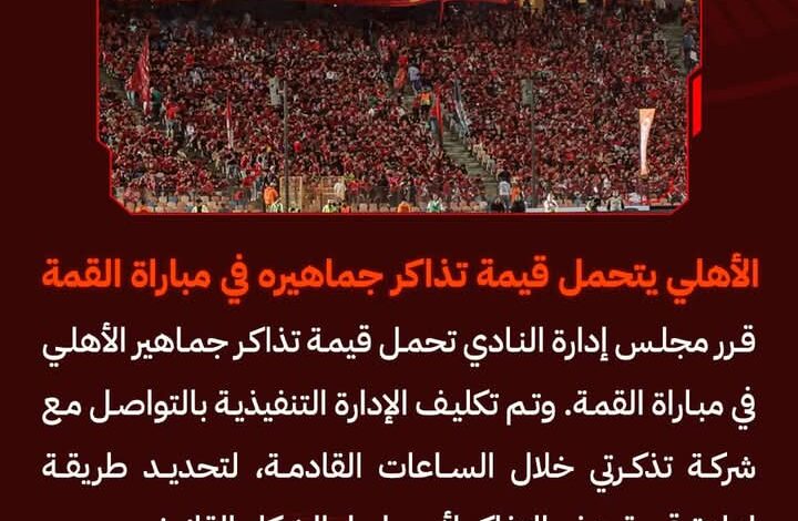 في لفتة تقدير لجماهيره الوفية، أعلن النادي الأهلي عن تحمله لقيمة تذاكر جماهيره في مباراة القمة، التي لم يشارك فيها الفريق بعد قرار عدم التوجه إلى استاد القاهرة.